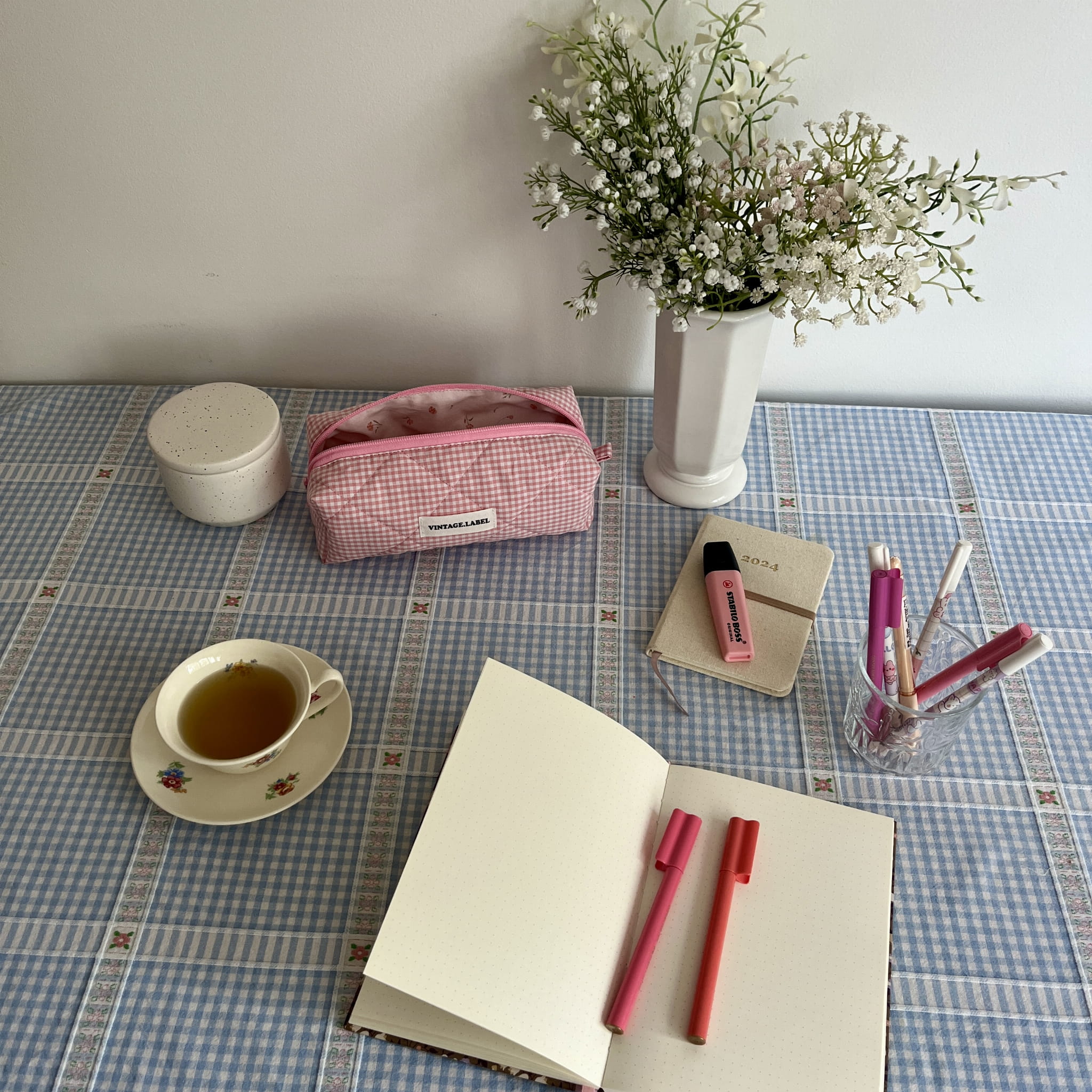 Piórnik w różową kratkę